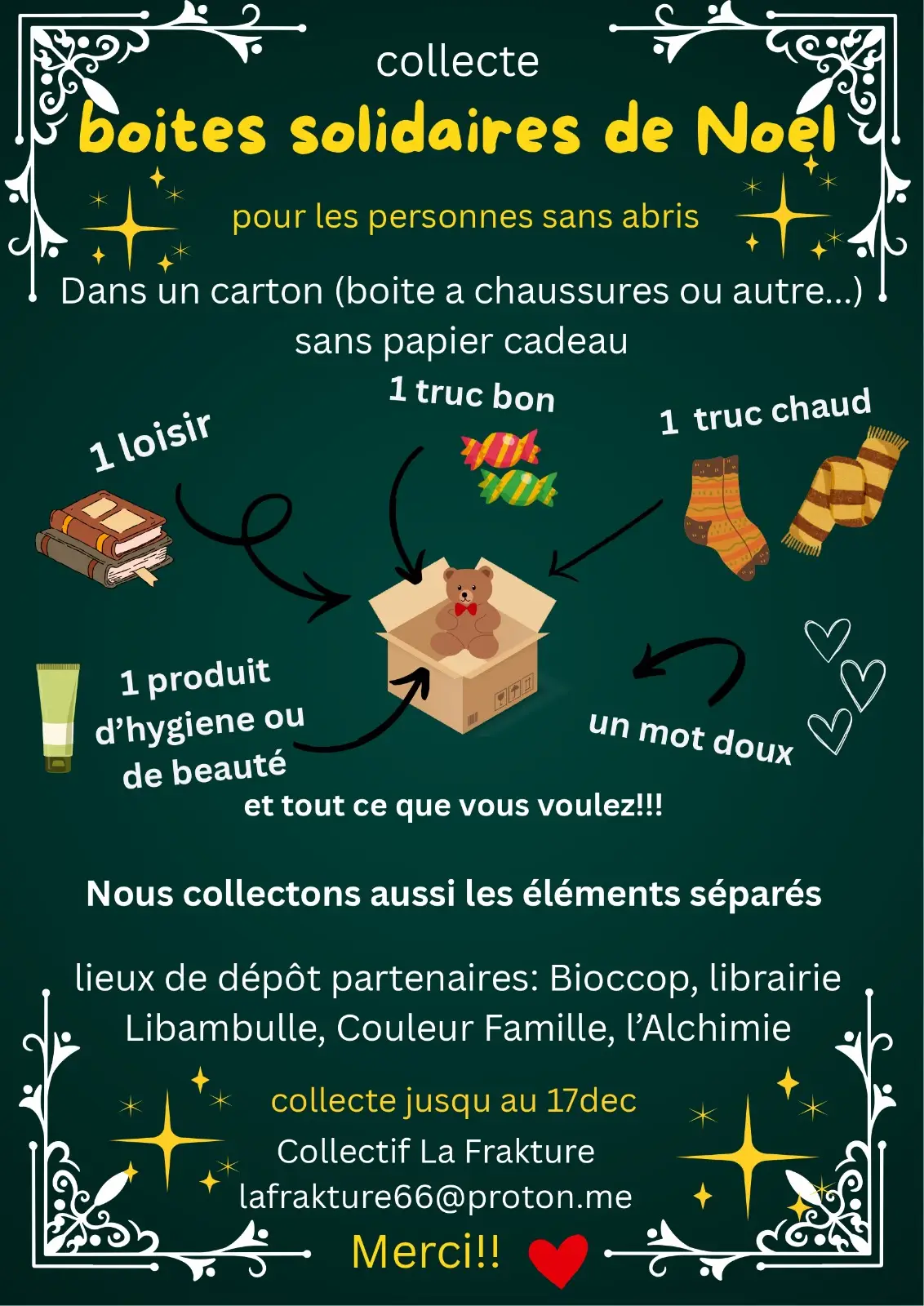 Cette Noël encore le collectif La Frakture organise la Collecte de Boîtes Solidaires de Noël pour les personnes sans abri. Biocoop La Plantula sera un des lieux de dépôt partenaire des cadeaux solidaires ensemble avec la librairie Libambulle, l'association Couleur Famille et le café associatif l'Alchimie. Vous pouvez déposer vos boites du 14 novembre au 17 décembre 2025.