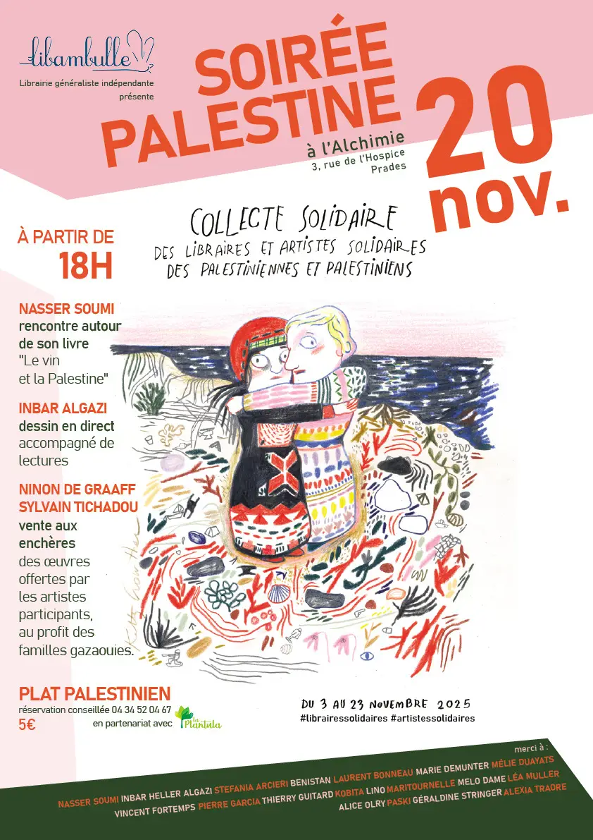 Ce jeudi 20 novembre à Prades, dans le cadre d'un projet initié par les libraires de l'ALIDO (Association des Libraires Indépendants d'Occitanie): Collecte Solidaire des libraires et des artistes solidaires des palestiniennes et palestiniens.